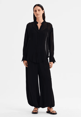 These lightweight chiffon georgette pants feature a flattering high-rise fit and narrow waistband. Designed with an invisible side zip, full-length balloon legs, and elasticated cuffed hems for a soft, modern silhouette. Fully lined for comfort.