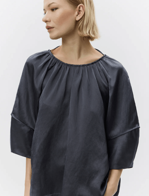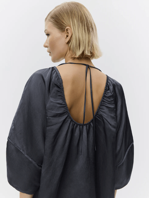 Description This top features cropped, ragalan sleeves, a scooped back, and a tie that goes across the back of the neck. The top has a loose fit.