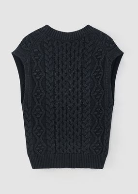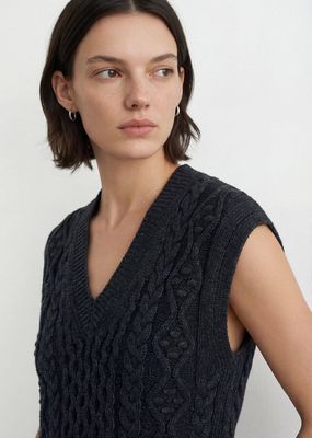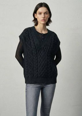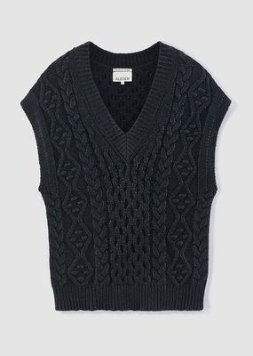 The ALEGER Black Foil Cable Vest is a standout, crafted from a blend of wool and sustainably sourced Cashmere with a refined black foil finish. Featuring chunky cable detailing and a deeper V-neckline, this versatile piece is ideal for layering or wearing on its own.